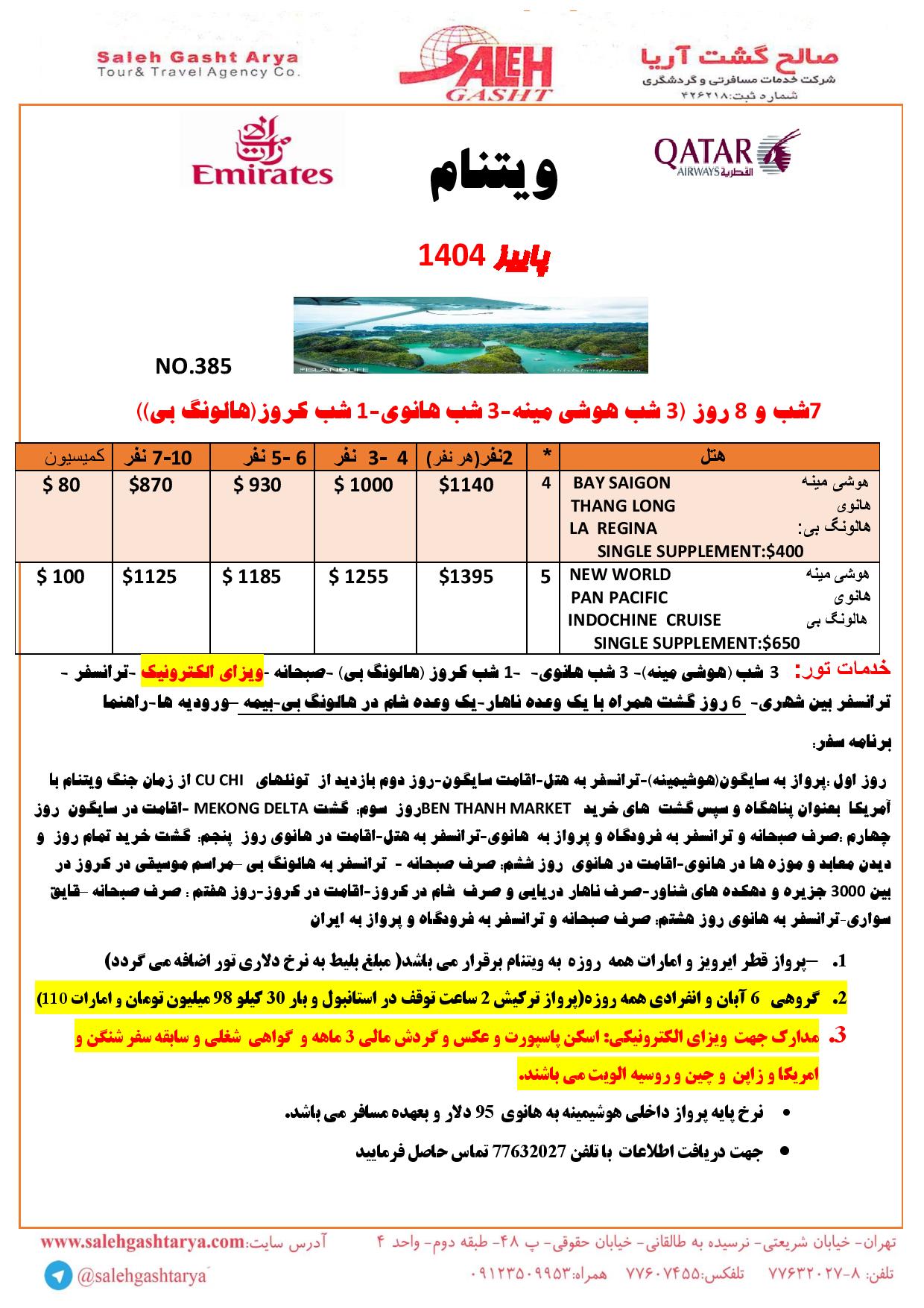 تور ویتنام پاییز 1404 شامل 3 شب اقامت در هانوی (پایتخت ویتنام) و 1 شب کروز در هالونگ بی و سپس هوایی به سایگون (هوشی مینه) و 3 شب اقامت سایگون بهمراه6 روز گشت و ترانسفرهای بین شهرها می باشد.تور فوق همه ایام نوروز با پرواز قطر و امارات اجرا گردیده و ترتیب اجرای تور از هانوی یا سایگون یکسان می باشد.