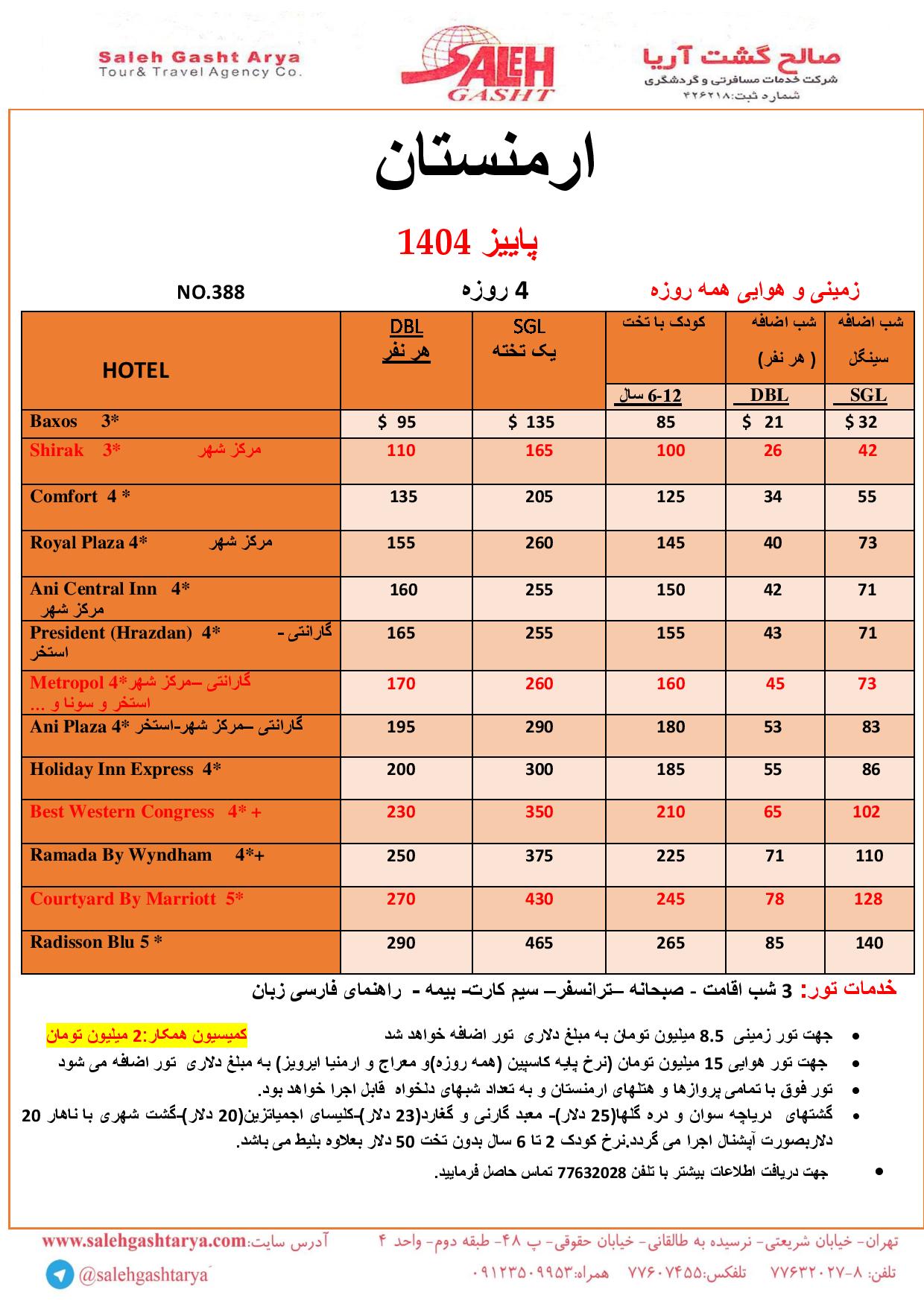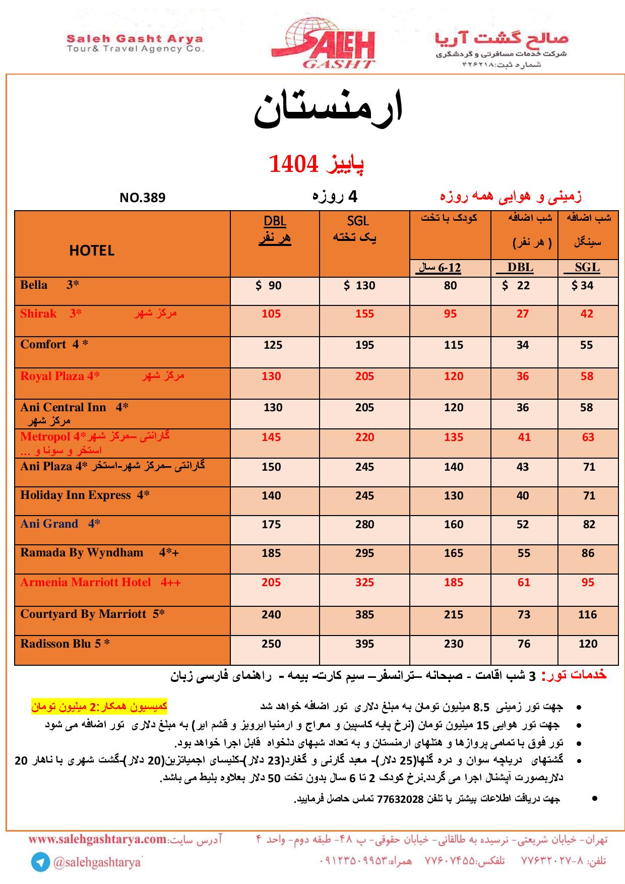 تور ارمنستان پاییز 1404همه روزه بصورت زمینی و هوایی با پروازهای فلای وان و ایران ایر تور و قشم ایر و کاسپین و ارمنیا ایرویز اجرا می گردد.