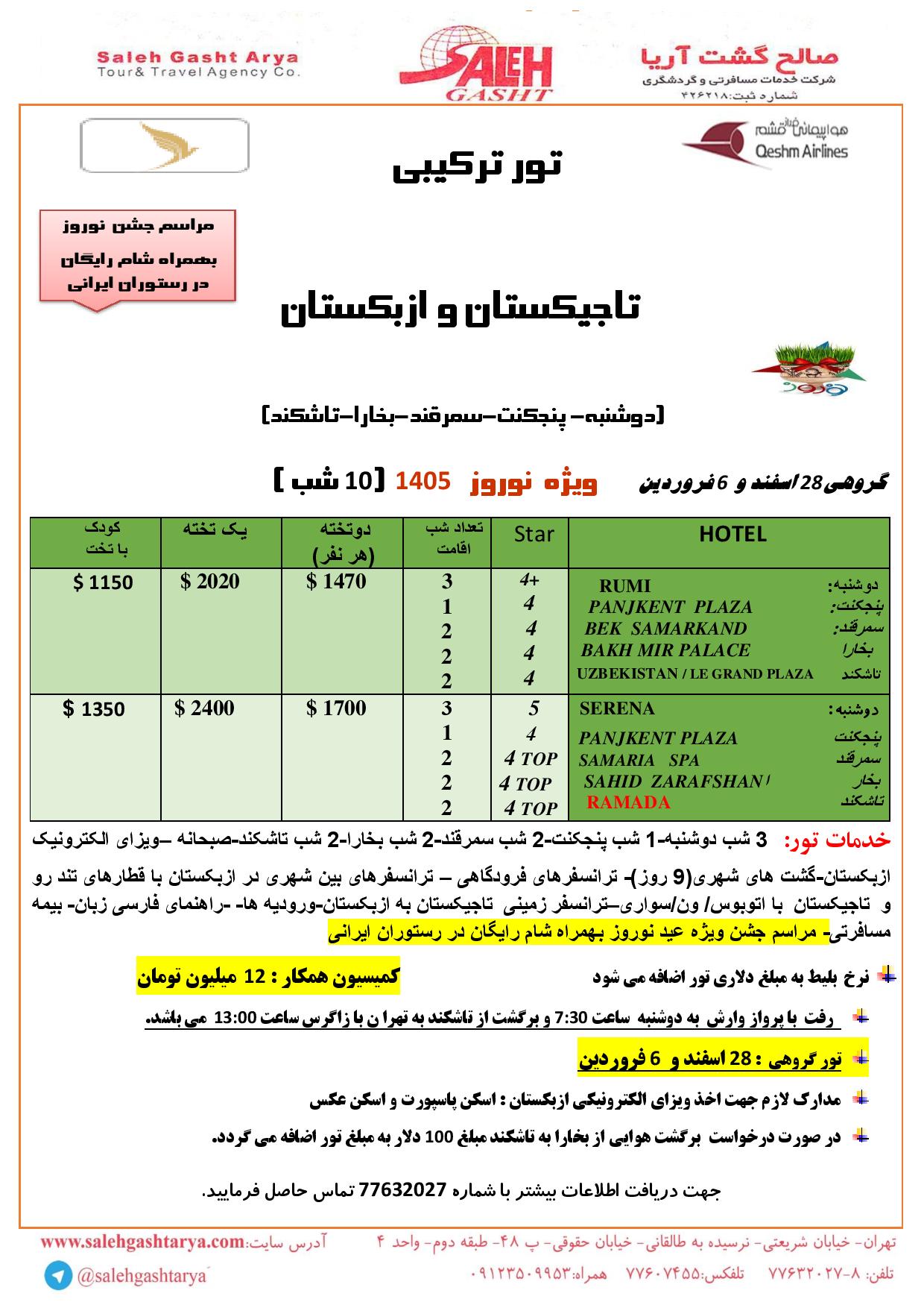 تور ترکیبی تاجیکستان و ازبکستان نوروز 1405 به مدت 4 شب در تاجیکستان در شهرهای دوشنبه و پتحکنت و سپس 6 شب در ازبکستان در شهرهای سمرقند و بخارا و تاشکند بصورت برنامه زیر می باشد.