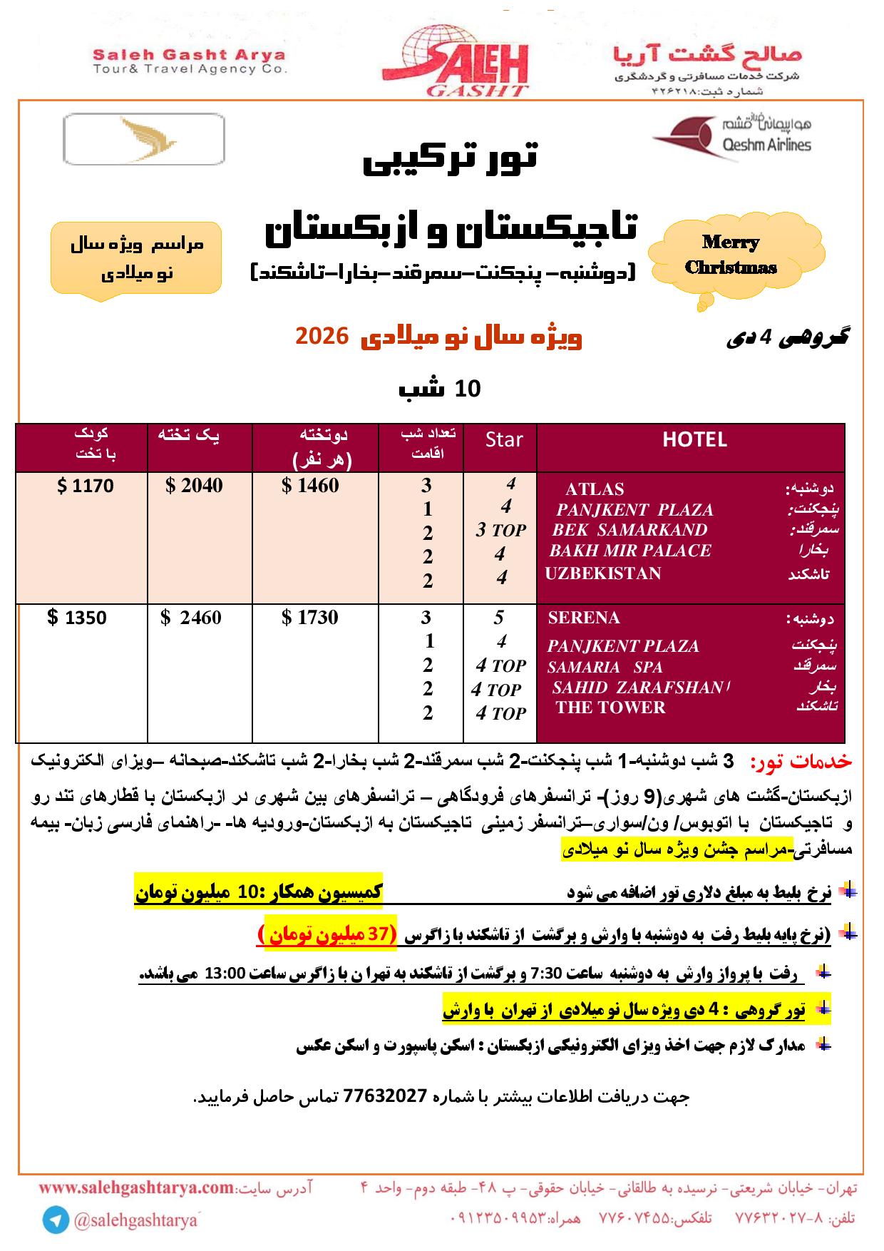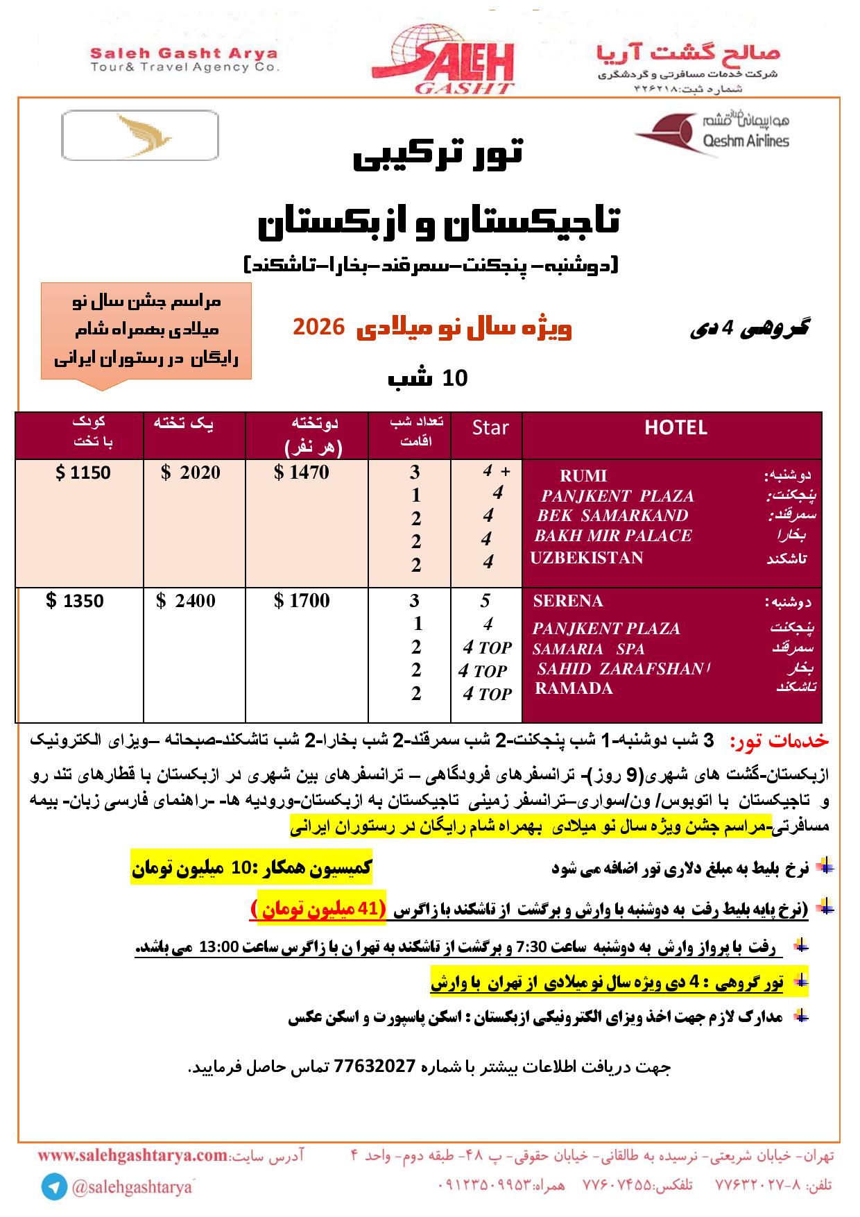 تور ترکیبی تاجیکستان و ازبکستان ژانویه 2026 به مدت 4 شب در تاجیکستان در شهرهای دوشنبه و پنجکنت و سپس 6 شب در ازبکستان در شهرهای سمرقند و بخارا و تاشکند بصورت برنامه زیر می باشد.