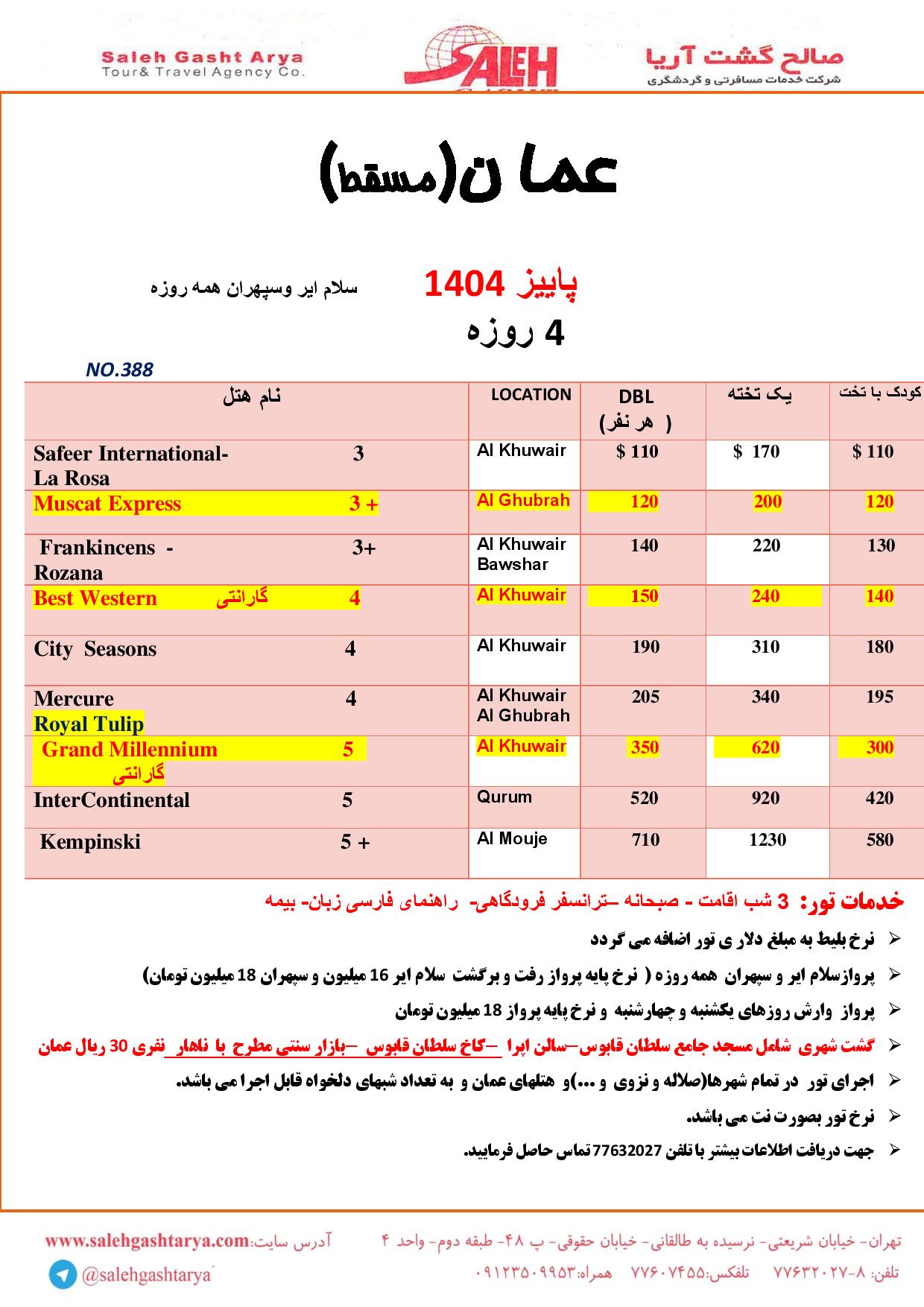تور عمان پاییز 1404 ایرلاین (وسیله نقلیه): سلام ایر وسپهران و قشم ایر قیمت از : تماس بگیرید وضعیت تور : در حال اجرااطلاعات تکمیلیدانــلود پکـــیج